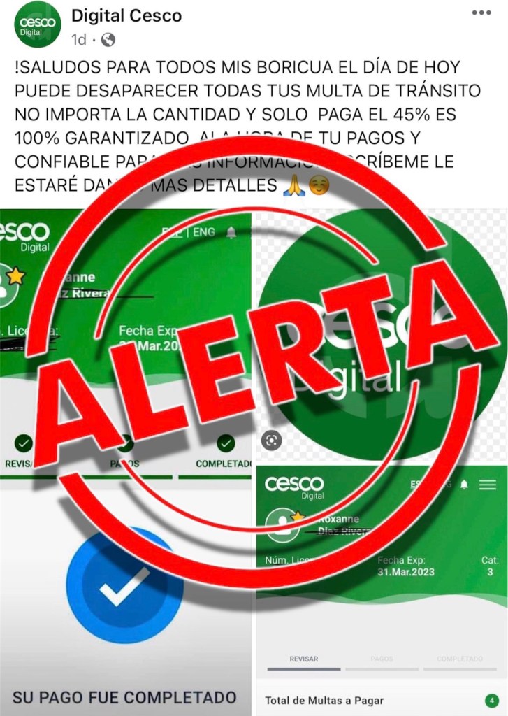 ALERTA | El Departamento de Transportación y Obras Públicas (DTOP) alertó esta tarde sobre una cuenta falsa de CESCO DIGITAL en las redes sociales . En la misma se alega que pueden eliminar todas sus multas de tránsito pagando una fracción del total adeudado.