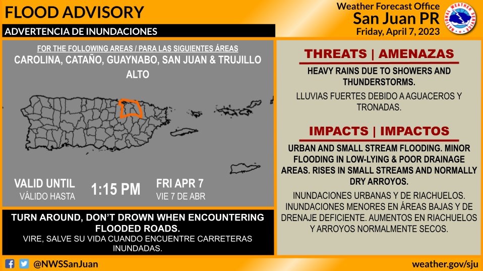 Mas temprano CAROLINA, CATAÑO, GUAYNABO, SAN JUAN & TRUJILLO ALTO fueron incluidos en otro Advertencia de Inundaciones Urbanas hasta las 1:15 PM.
