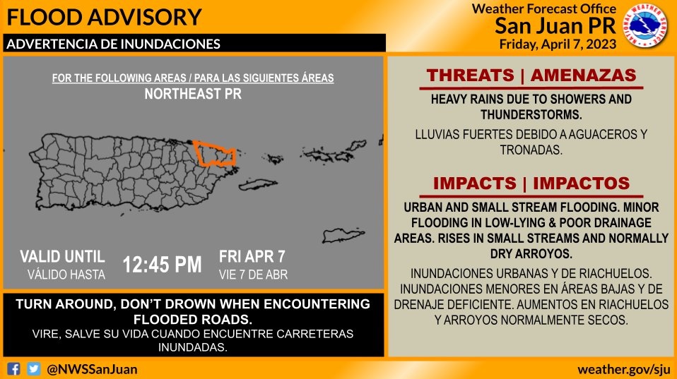 7/abril/2023 – El Servicio Nacional de Meteorología en San Juan (NWS) emitió una Advertencia de Inundaciones para varios municipios de la isla durante Viernes Santo.