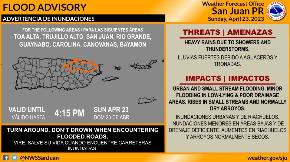 23/abril/2013- El Servicio Nacional de Meteorología en San Juan emitió una advertencia de inundaciones repentinas hasta las 4:15 pm del domingo para los municipios de TOA ALTA, TRUJILLO ALTO, SAN JUAN, RIO GRANDE, GUAYNABO, CAROLINA, CANOVANAS, BAYAMON.