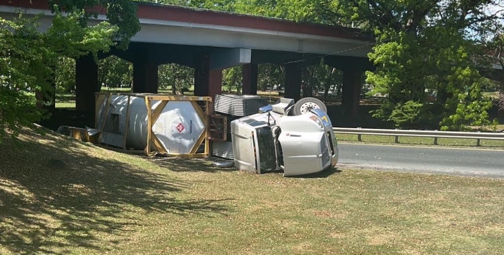El camión y un arrastre de 6,000 de combustible se volcaron en la rampa de acceso del expreso Kennedy (PR2) hacia el Exp Muñoz Rivera (PR-1) en dirección a Miramar y la Isleta de San Juan.