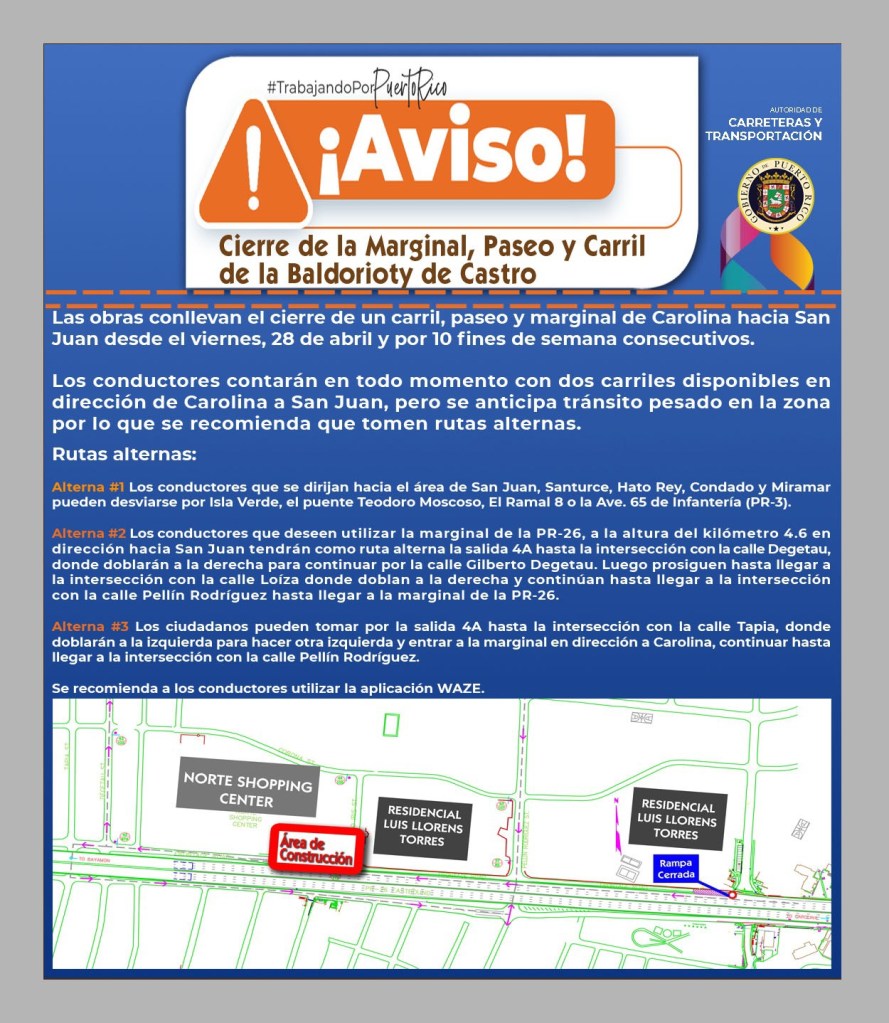 La Autoridad de Carreteras y Transportación (ACT) anunció trabajos en el Expreso Román Baldorioty de Castro (PR-26), en el kilómetro 4.6 (frente a la cancha bajo techo del Residencial Llorens Torres) en dirección de Carolina a San Juan.