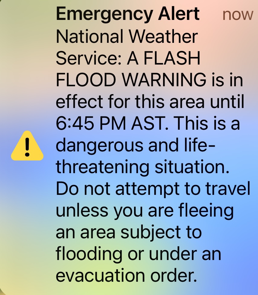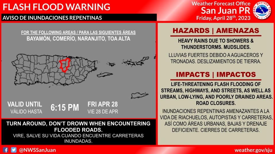 A las 5:00 PM el SNM informó que los municipios de BAYAMÓN, COMERIO, NARANJITO y TOA ALTA estaban bajo Aviso de Inundaciones hasta ls 6:15 pm debido a que habían recibido de 4 a 7 pulgadas de lluvia. Se esperaba que cayeran de 1 a 2 pulgadas adicionales.