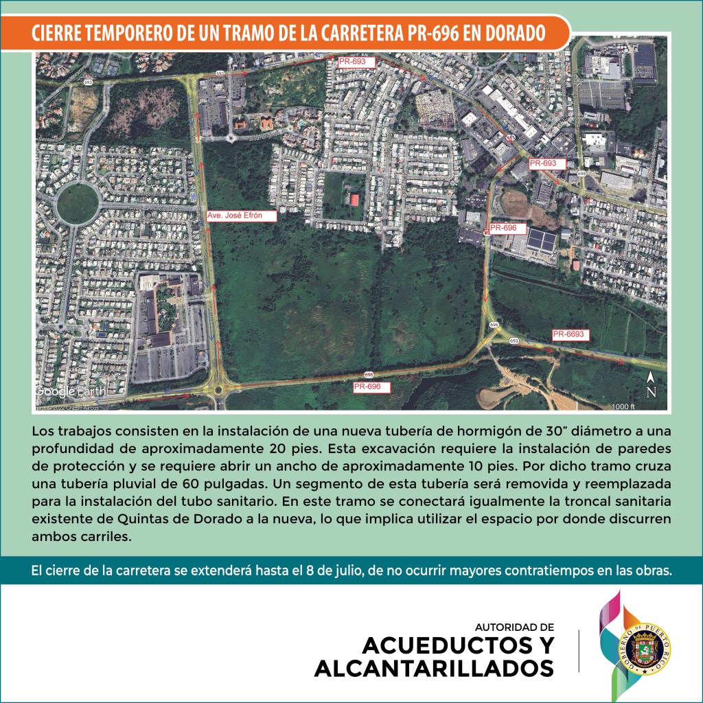 La Autoridad de Acueductos y Alcantarillados (AAA), a través de su director regional, José A. Rivera Ortiz, anunció el cierre temporero de un tramo de la carretera PR-696 en Dorado, desde la rotonda Los Delfines hasta la rotonda frente al Doctor’s Center Hospital Orlando Health.