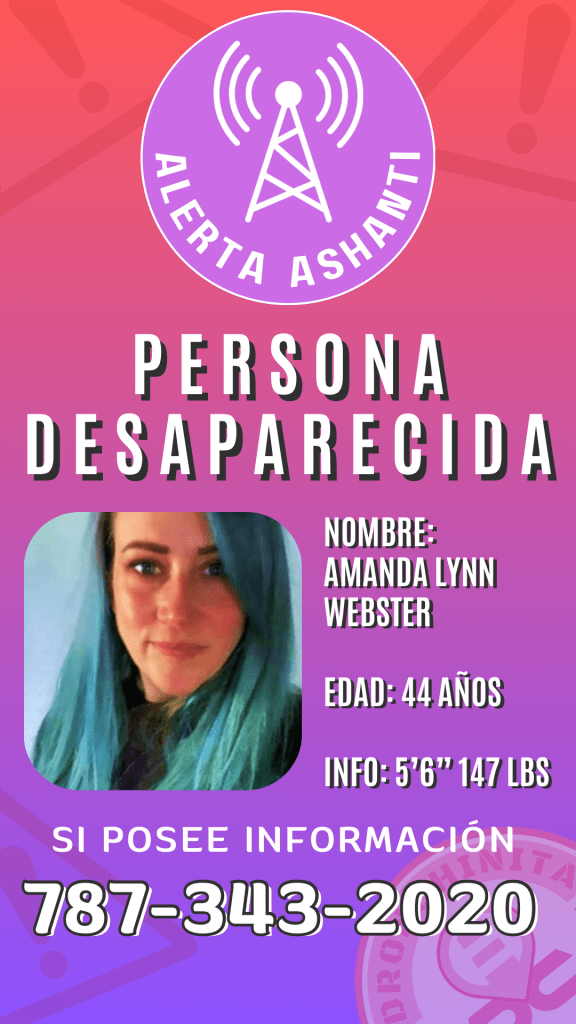 Amanda Lynn Webster fue vista por última vez en el barrio Florida sector Camino Viejo en Naguabo. La turista de 44 años, tez blanca, cabello rubio, ojos azules, 5 pies y 6 pulgadas de altura y pesa 147 libras.