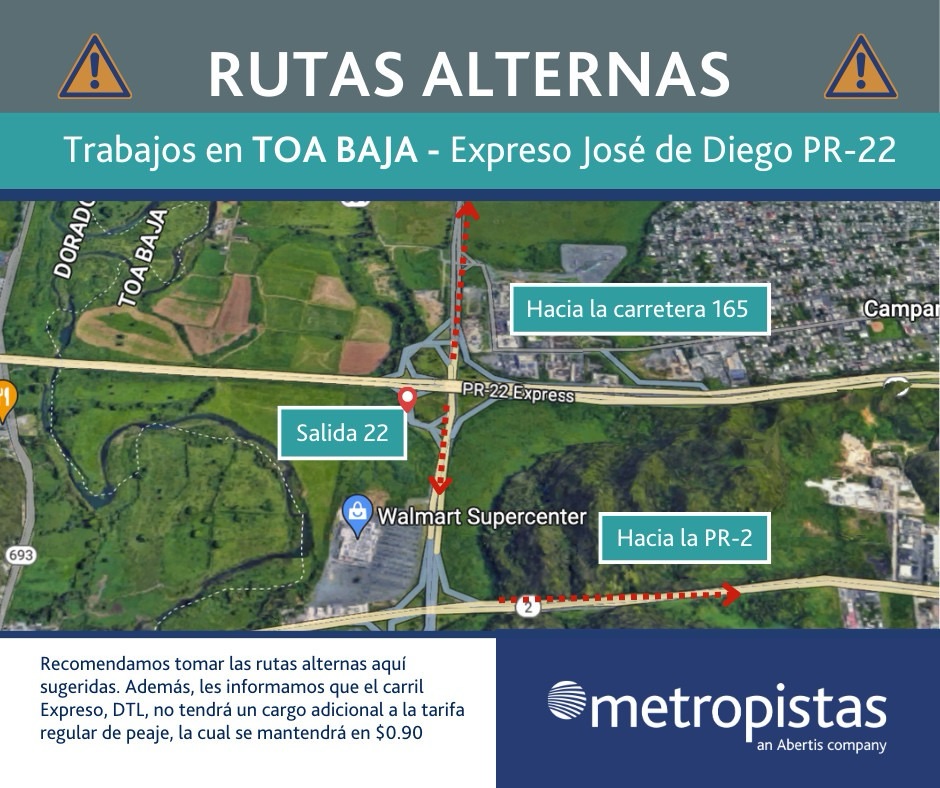 Aparte del uso sin costo adicional del carril dinámico, se informa como ruta alterna la Salida 22 hacia la PR-2 o la PR-165 por la costa. Se incluye diagrama con muestra